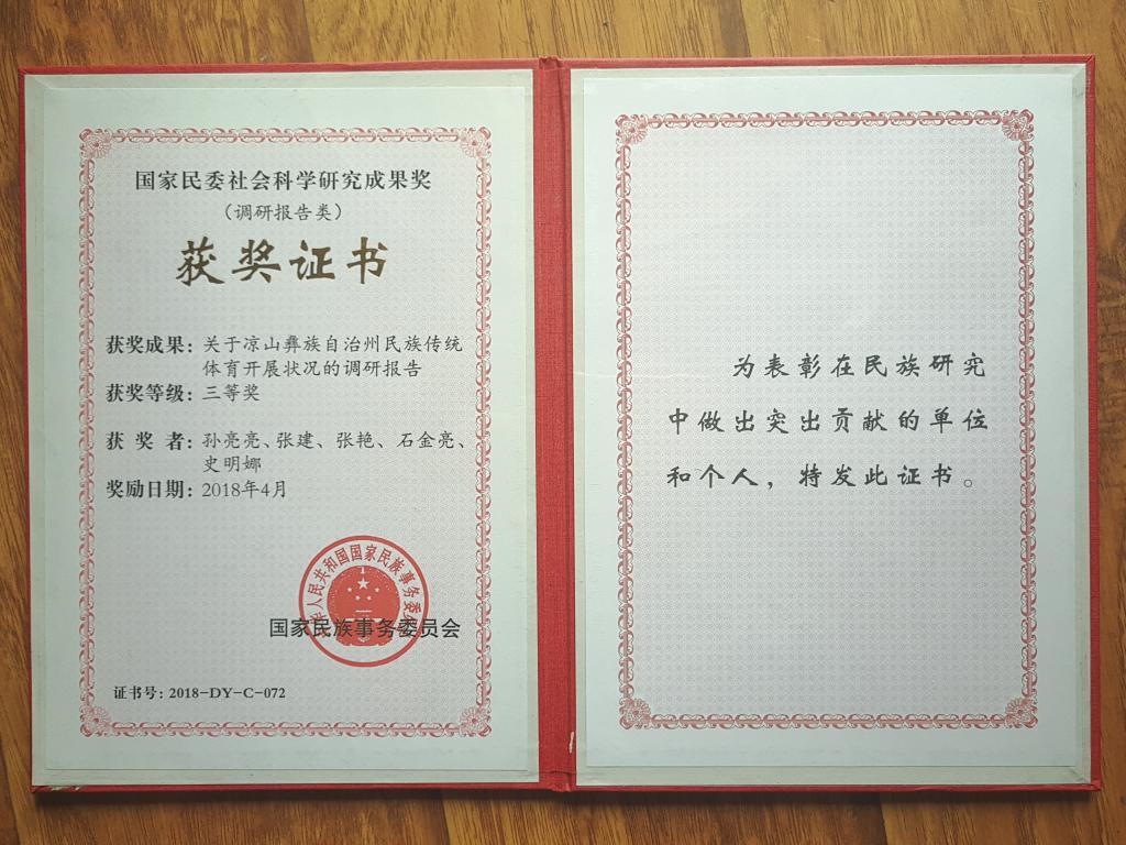 近日,国家民委2017年度全国民族工作优秀调研报告评选结果揭晓。公司孙亮亮副教授带领研究团队完成的《关于凉山彝族自治州民族传统体育开展状况的调研报告》,荣获国家民委社会科学研究成果奖(调研报告类)三等奖。