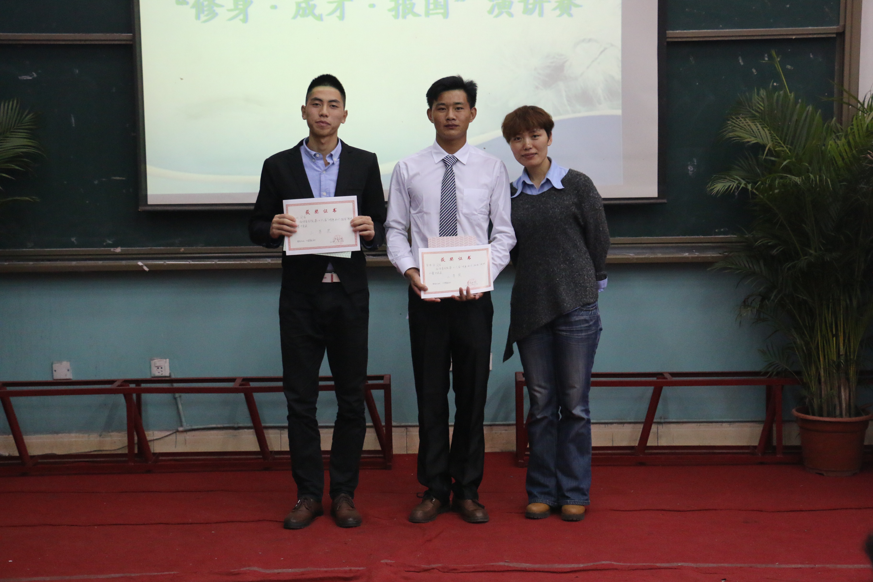 比赛中,选手们结合各自的亲身经历,紧紧围绕主题讲述着一个个不平凡事迹和感人故事。选手们慷慨激情的演讲,立志报国的誓言引起了在场观众的共鸣。经过一个半小时的激烈角逐,2014级6班李梦霞同学9 .45最高分荣获本次比赛一等奖。安秀华、谭毅同学荣获二等奖。最后,李霞、那明明老师为获奖选手颁奖合影。