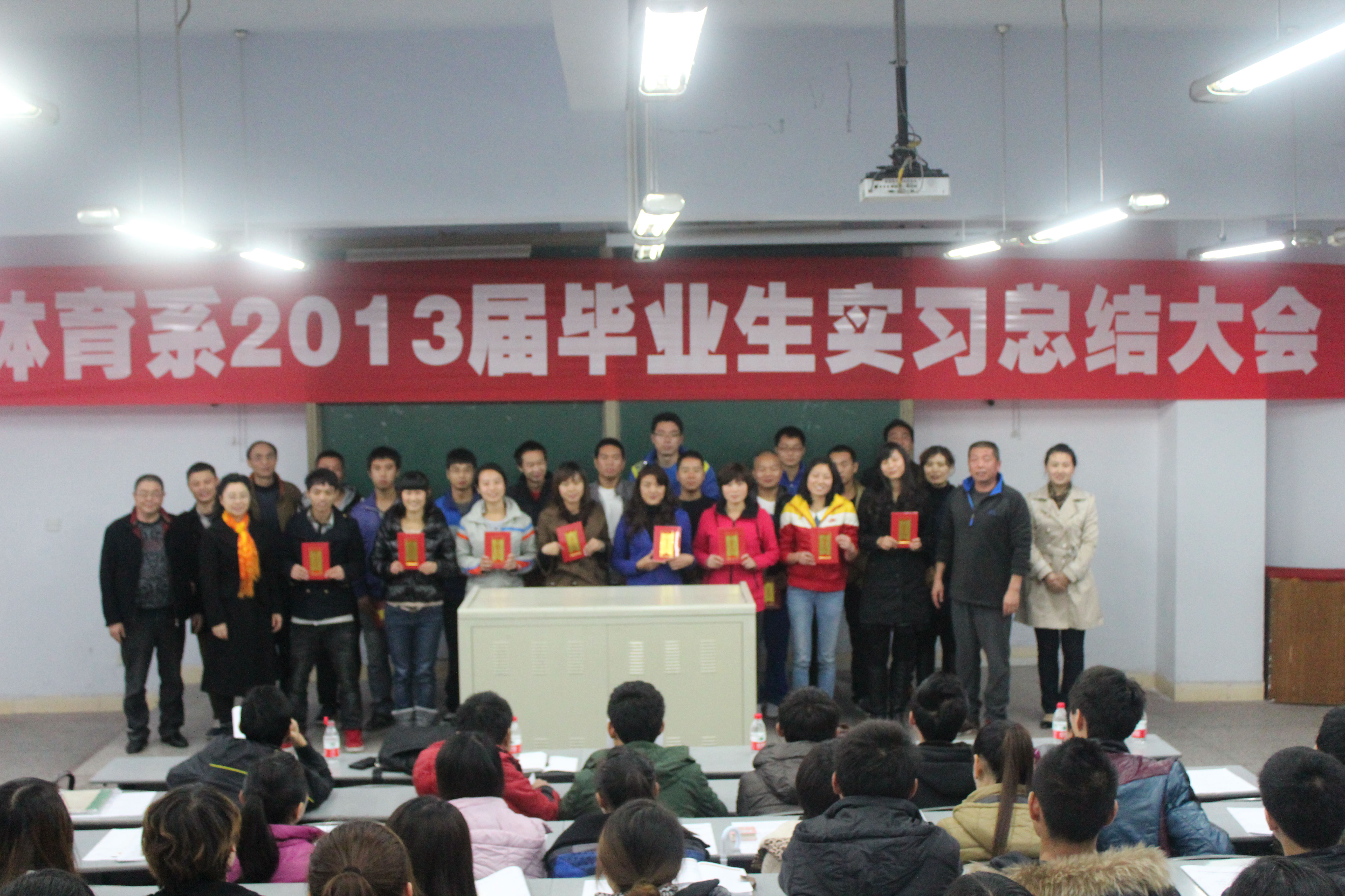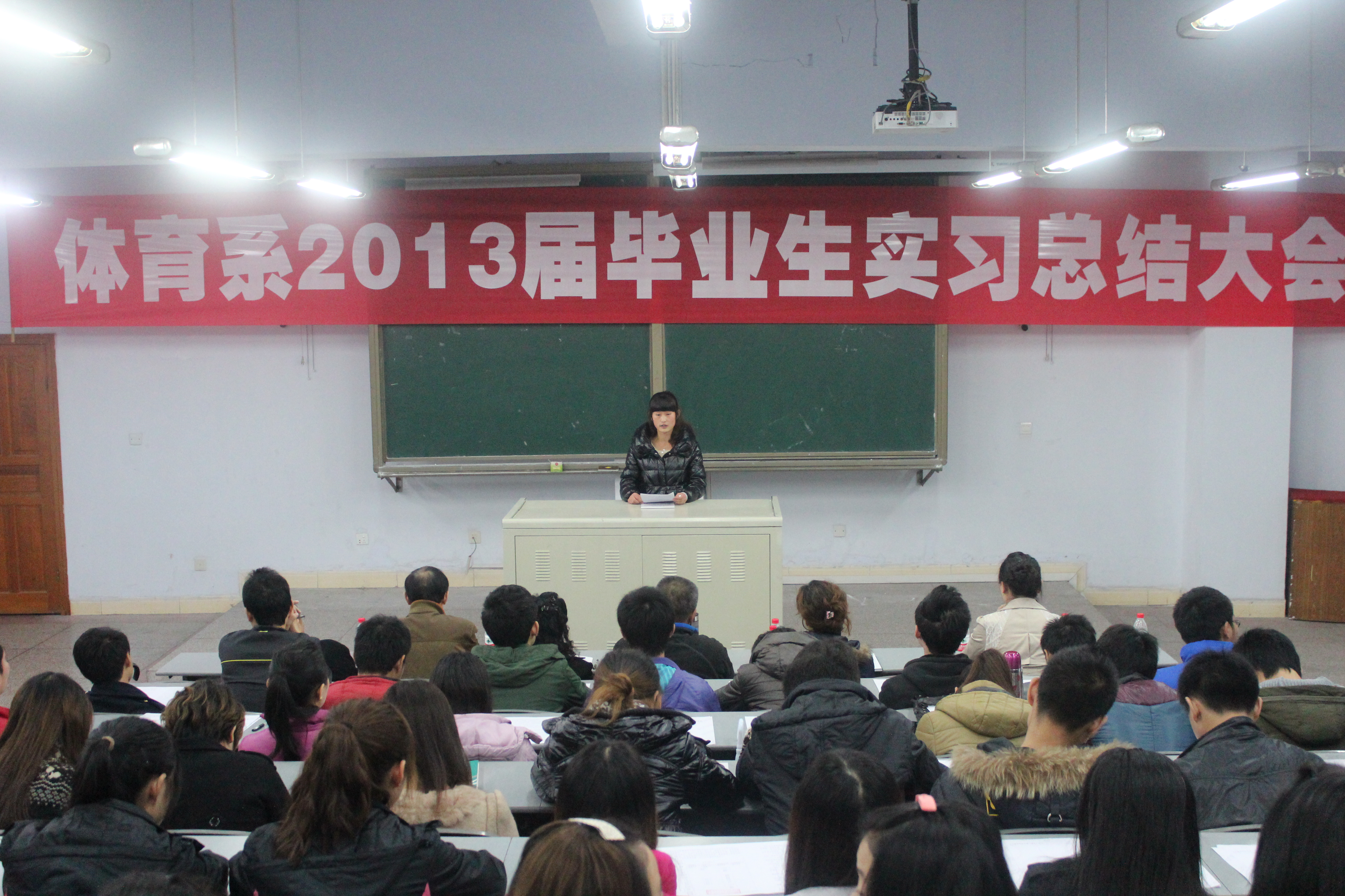 2012年11月15日下午4:30,betway西汉姆联平台体育系2013届毕业生在莲湖校区教学楼125教室举行实习总结大会。此次大会由何其波同学主持,参加此次大会的有教务处曹科长、体育系主任董立教授、体育系副主任陈碧述教授、体育系李文华老师、体育系团总支书记兼辅导员李霞老师、体育系辅导员那明明老师,以及体育系2013届的全体毕业生。