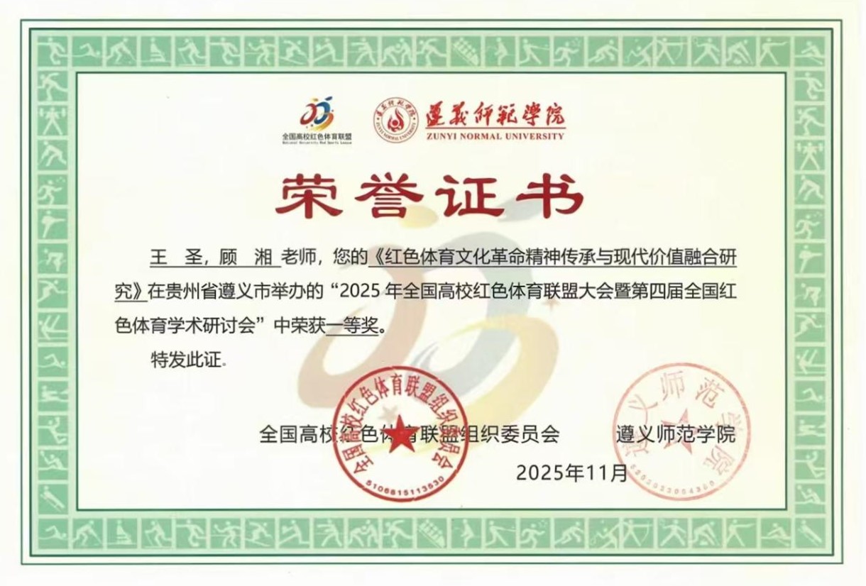 近日,全国高校红色体育联盟大会暨第四届全国红色体育学术研讨会在遵义师范公司召开。betway西汉姆联平台王圣博士受邀参会,他以《红色体育文化革命精神传承与现代价值融合研究》为题,在此次研讨会上作专题报告并荣获一等奖,成为公司深化红色育人实践的重要成果。