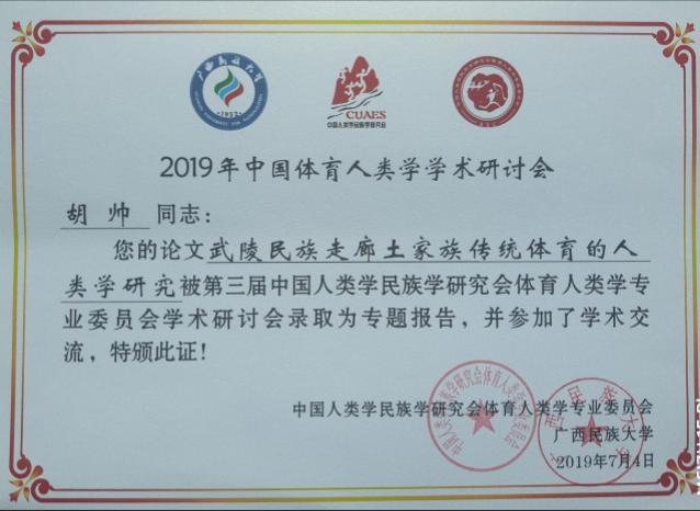 2019年7月3日至7日,第三届中国体育人类学学术研讨会在广西民族大学举行。公司青年教师胡帅所投的《武陵民族走廊土家族传统体育的人类学研究》被录取为专题报告,并进行了专题发言。