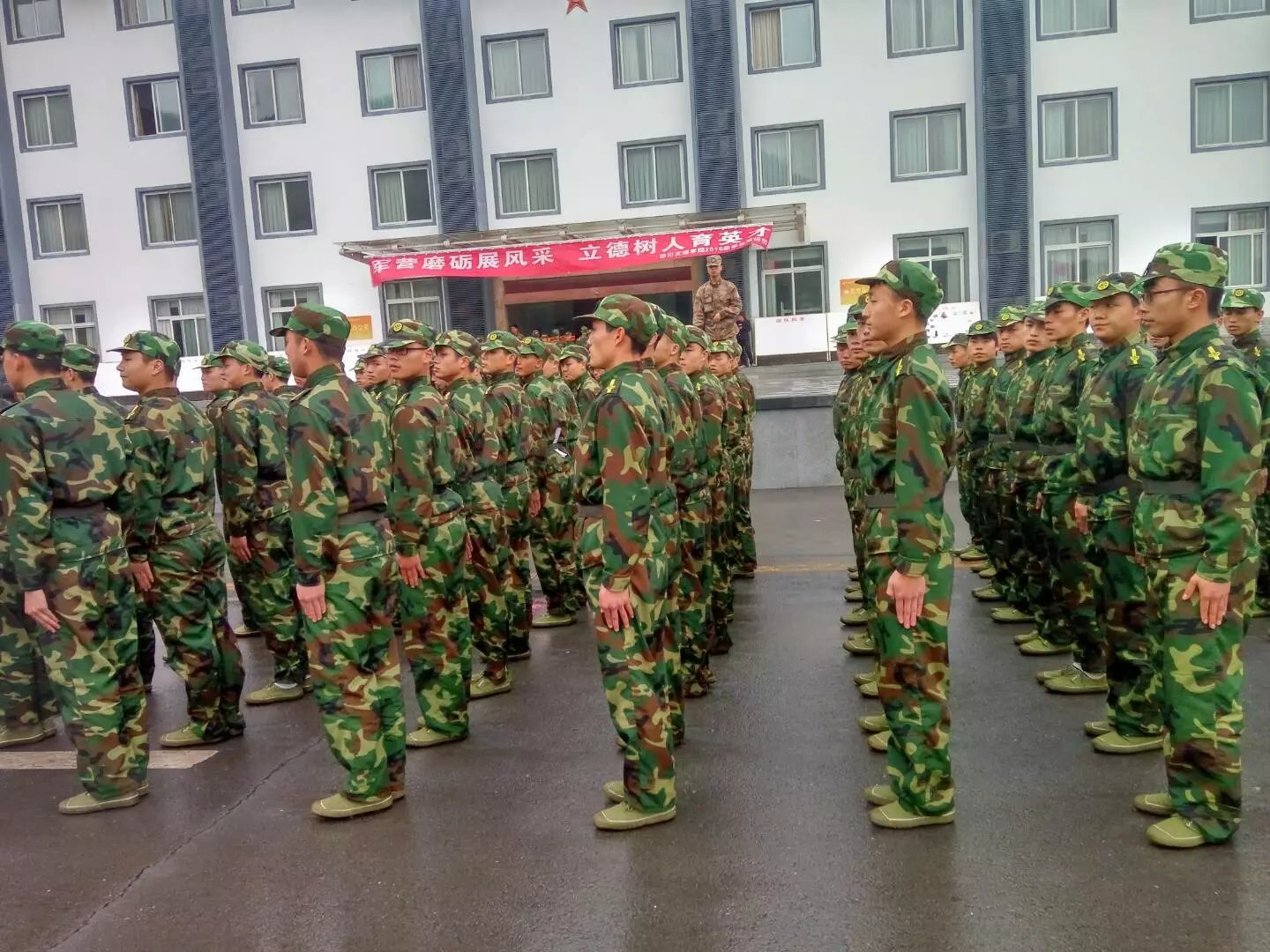 公司16级新生的军训已经进行了两天。阴雨绵绵的天气为同学们的训练带来了些许的不便,但在水滑的地面和橄榄绿的迷彩军装相互辉映,同学们显得活力十足。军官们严格要求新生整理军容和端正军姿,不时亲自示范,并手把手纠正基本的动作,同学们在军官的带领下认真训练,没有丝毫懈怠。