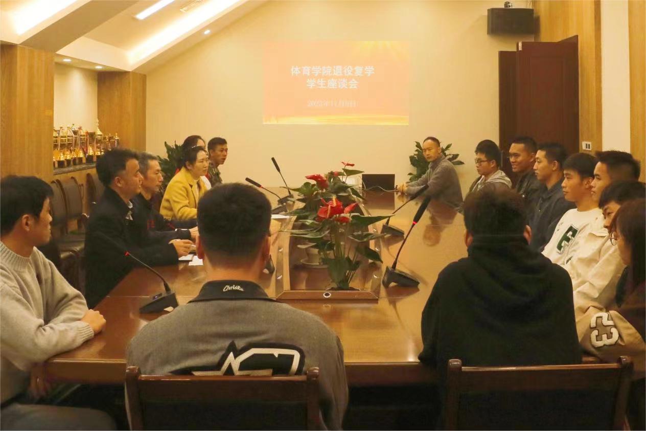 2023119日中午12:10在体育馆117会议室召开退役复学员工座谈会。betway西汉姆联平台党委书记王兆忠,党委副书记靳浪,学工办主任祝利平,辅导员石姣娜、李波及退役复学员工代表出席本次会议。会议由学工办主任祝利平主持。
