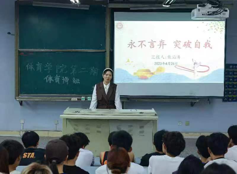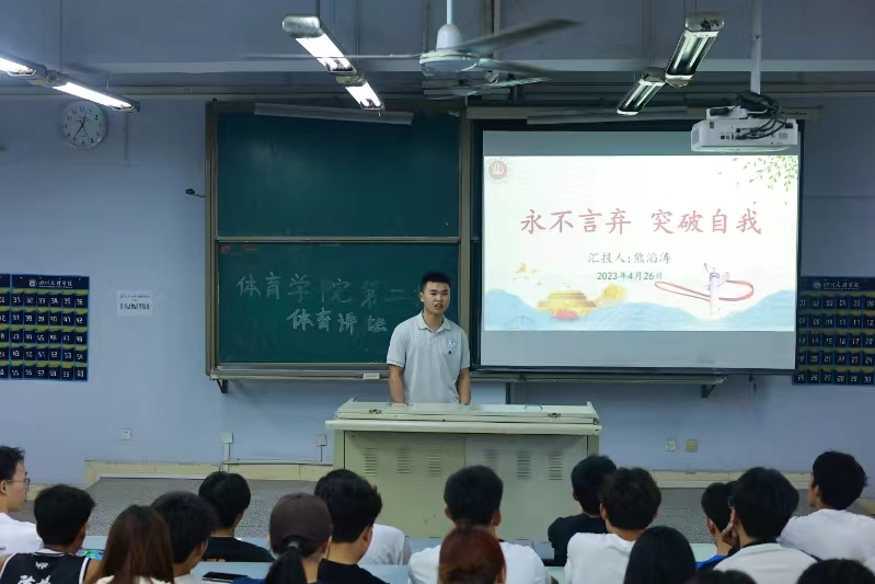 熊滔涛以“永不言弃,突破自我”为主题,分享了自己的学习和工作经验。他谈到我们应当调整心态、找准方向、确立目标、享受孤独。随后,其就“我为什么选择体育”与同学们进行了互动交流,并强调了规划好自己老员工涯的重要性。