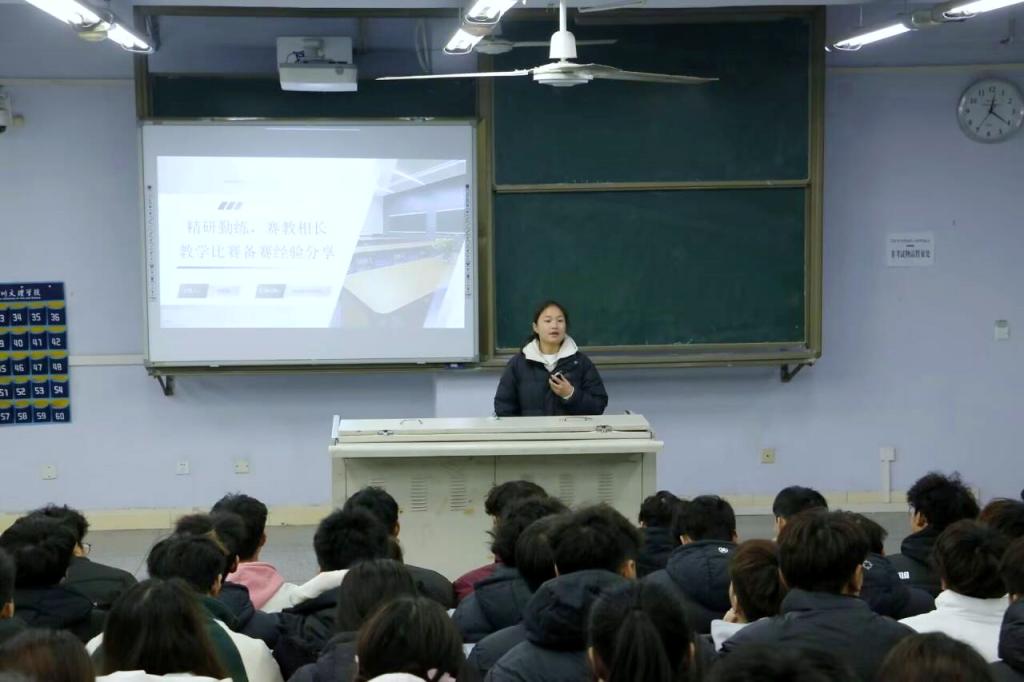 邓程稀以“精研勤练,赛教相长”为题,着重讲解了教材与学情分析、教学流程设计等环节,告诉大家教学过程中教态、语言规范、手势等细节的重要性。江旭日以“赛场逐梦,师能铸魂”为主题,基于国家新课标,详细分享了说课的具体内容及详细流程,结合比赛经历,强调参加竞赛以及高强度的备赛是师范生提升教学能力的重要途径。